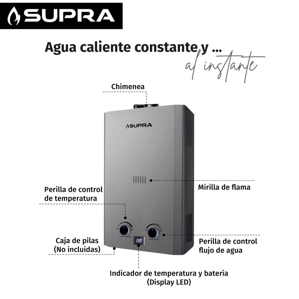 - ¡AGUA CALIENTE CONSTANTE Y AL INSTANTE! El calentador de agua instantáneo SUPRA de 6 Litros para Gas L.P. esta diseñado para brindar comodidad y agua caliente al instante con el máximo ahorro y seguridad. Convirtiéndose en el calentador ideal para familias y/o departamentos pequeños.