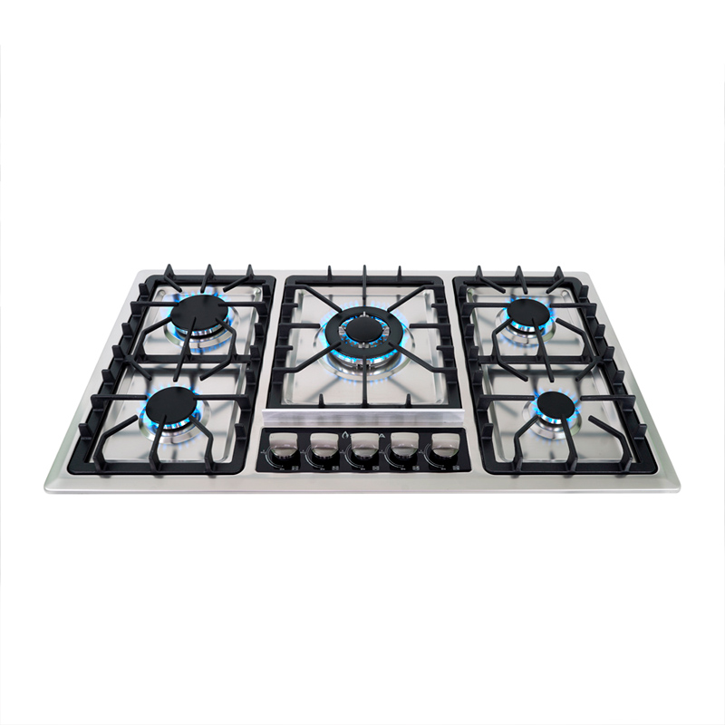 Parrilla a gas de 5 quemadores para empotrar de 87 cm con cubierta de acero inoxidable.