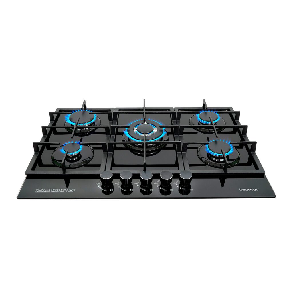 • Parrilla a gas de 5 quemadores para empotrar de 76 cm con cubierta de cristal templado color negro.