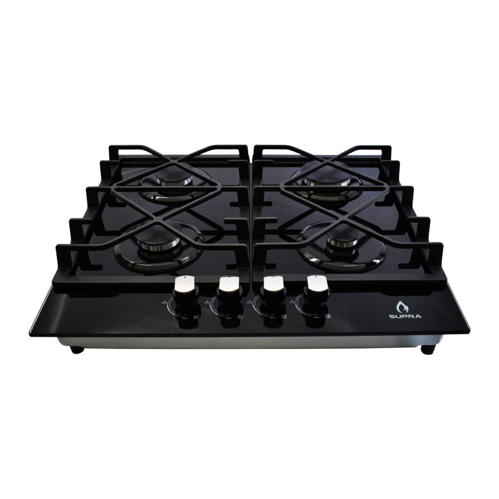 Parrilla a gas de 4 quemadores para empotrar de 60 cm con cubierta de cristal templado color negro para gas L.P. y gas Natural.