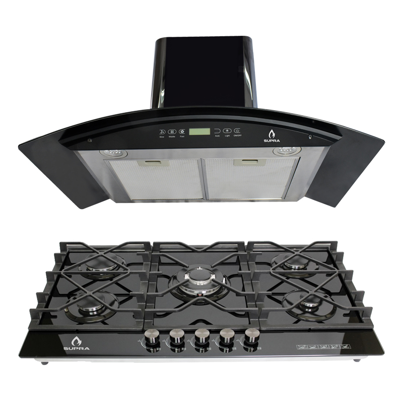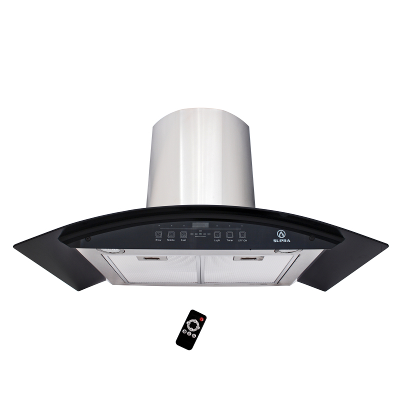 - Campana de 90 cm para cocina de acero inoxidable con cristal curvo.