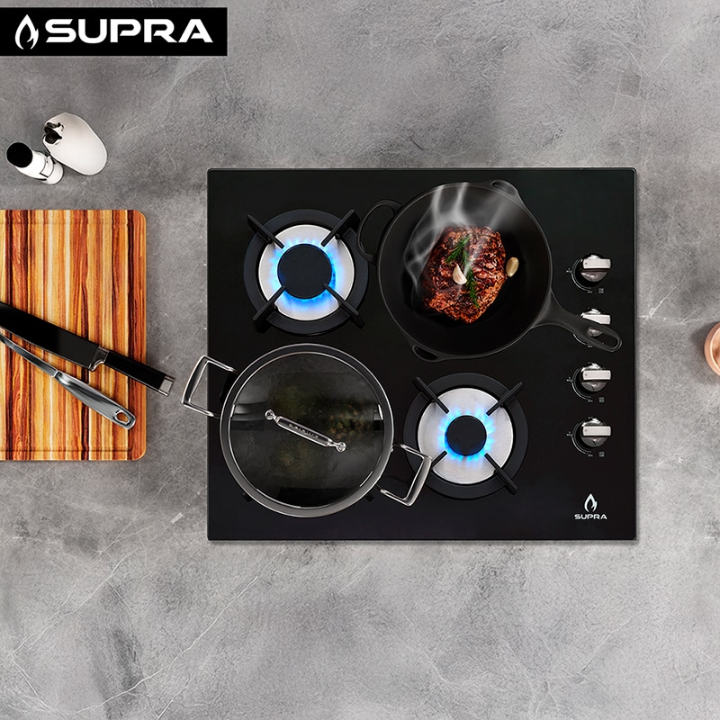 - Parrilla a gas de 4 quemadores para empotrar de 60 cm con cubierta cristal templado en color negro.